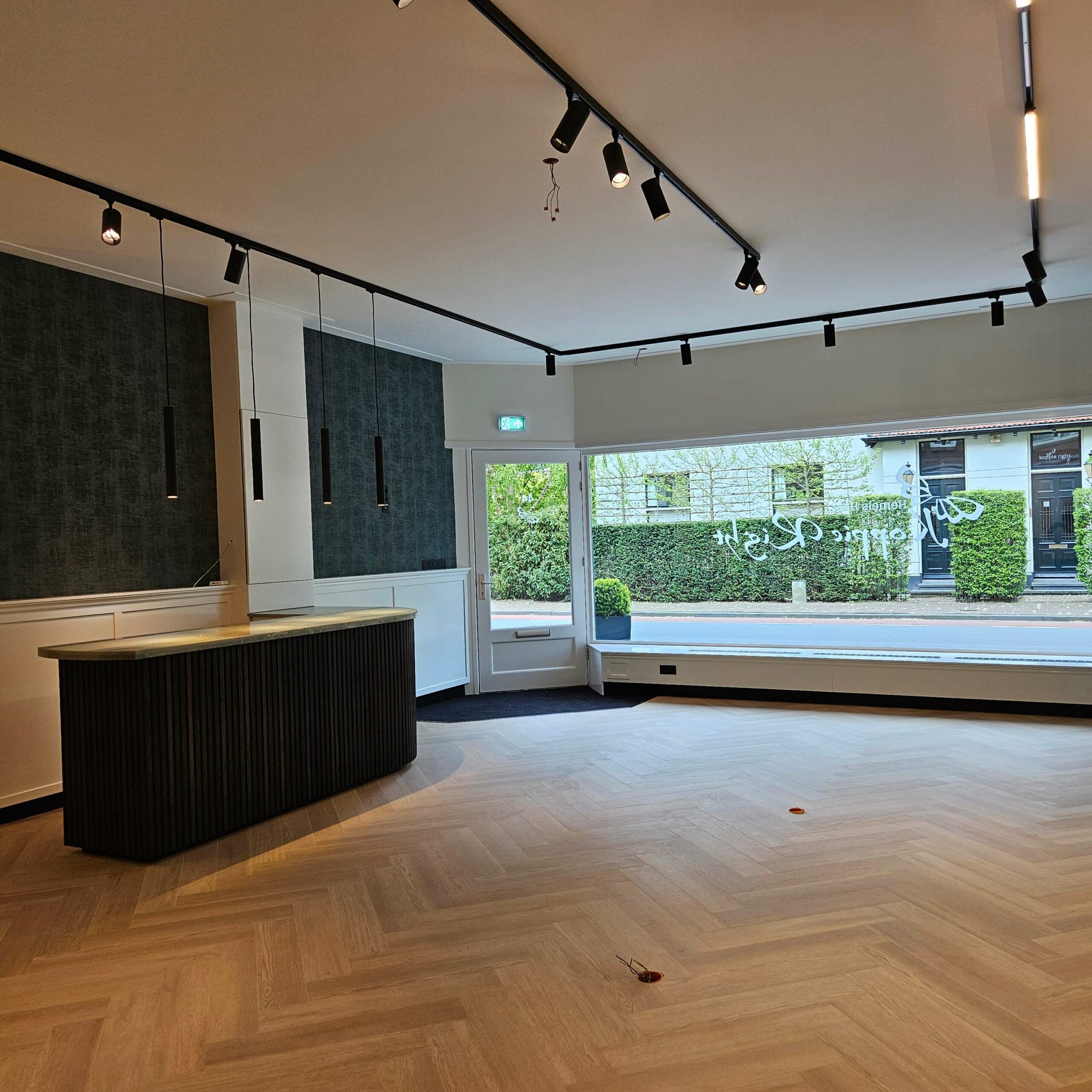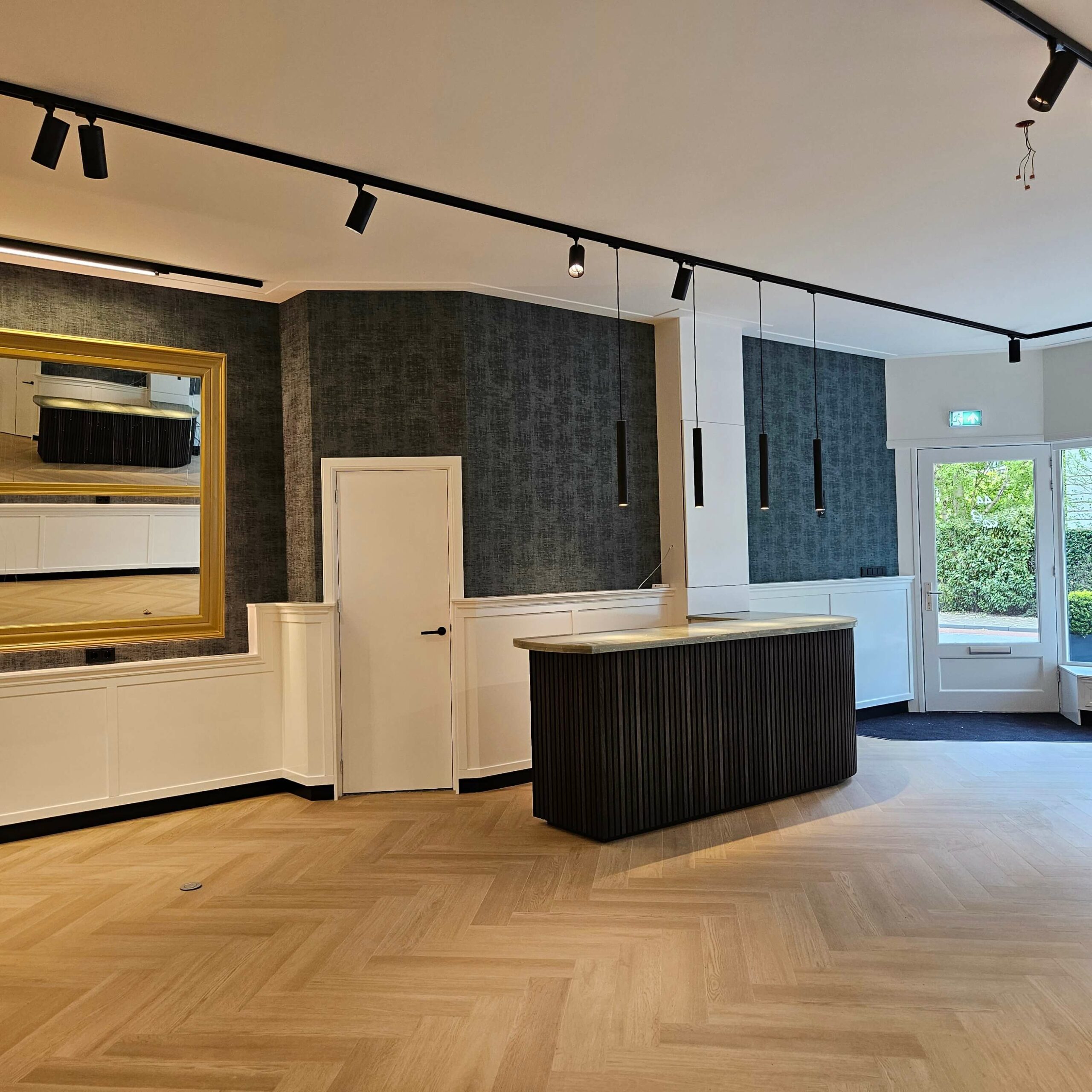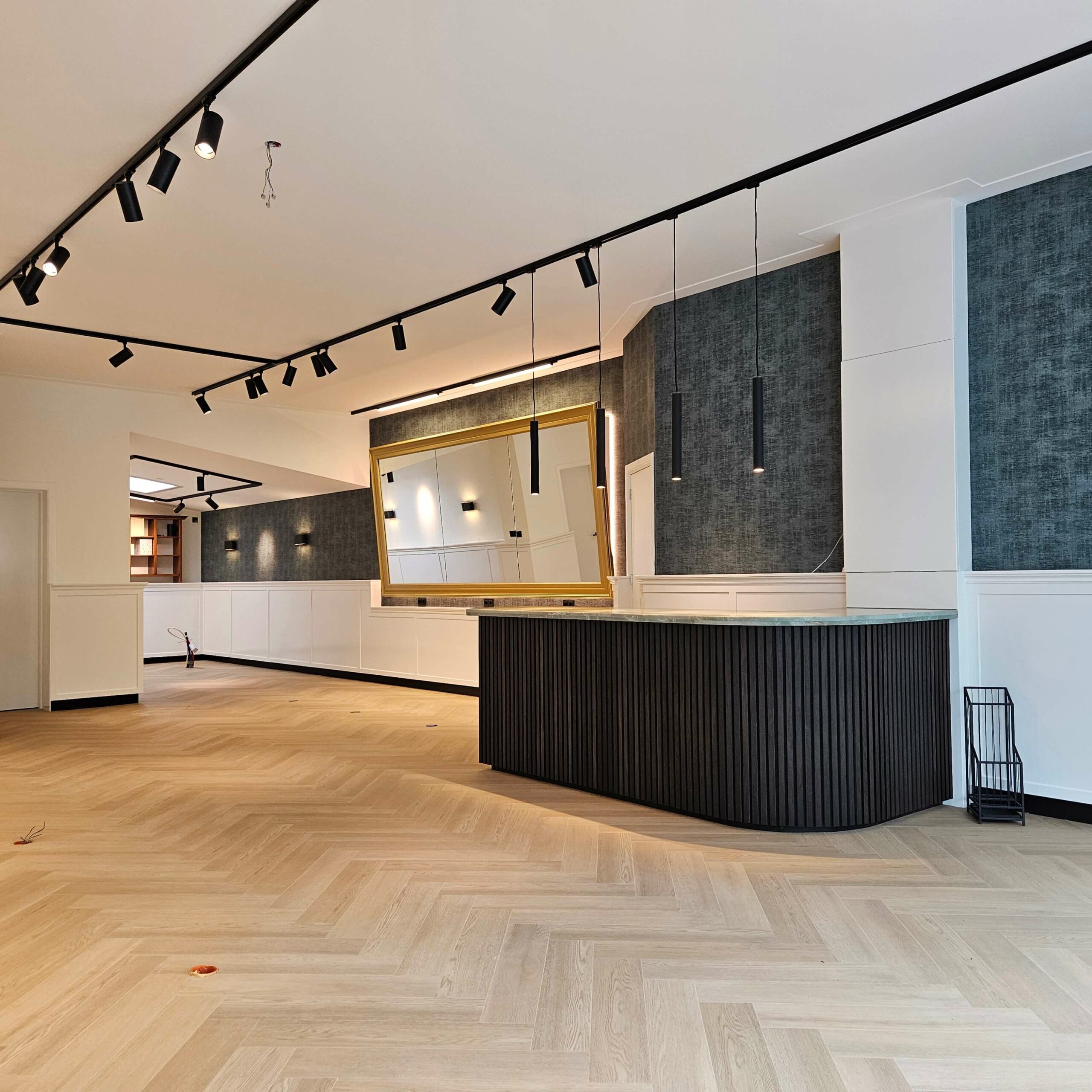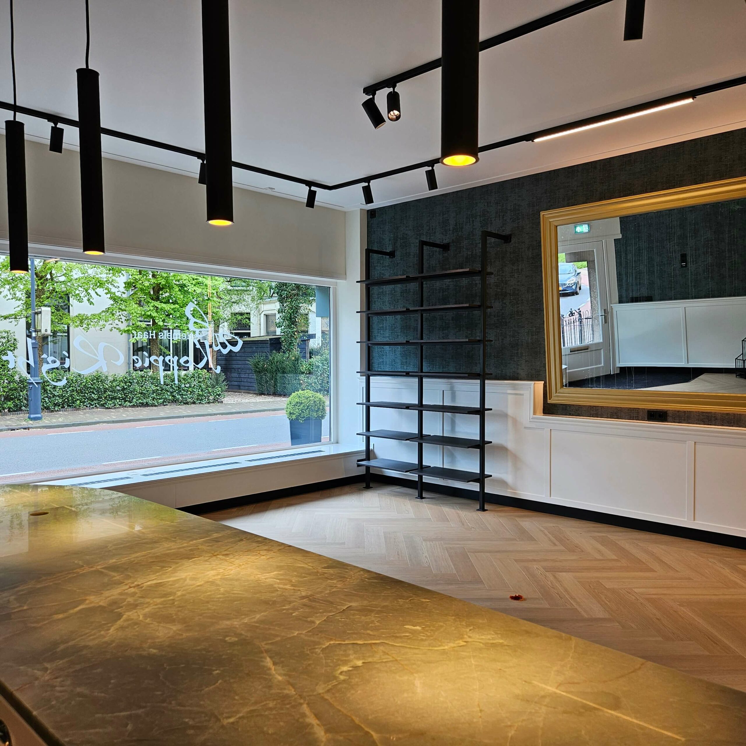 Na een grote waterschade hebben we deze kapperszaak volledig hersteld en vernieuwd. De plafonds zijn opnieuw opgebouwd met brandwerende gipsplaten en akoestische isolatie. Wanden, lambrisering en voorzetwanden zijn opnieuw getimmerd en strak gestuct. De gietvloer en toonbank zijn vervangen — de nieuwe toonbank kreeg een marmeren blad met eiken accenten. De stalen kast is op maat gemaakt door ons zusterbedrijf Van Vorden Staal BV. Alles is geschilderd en afgewerkt tot in detail, met als resultaat een moderne, frisse salon die weer helemaal klopt.