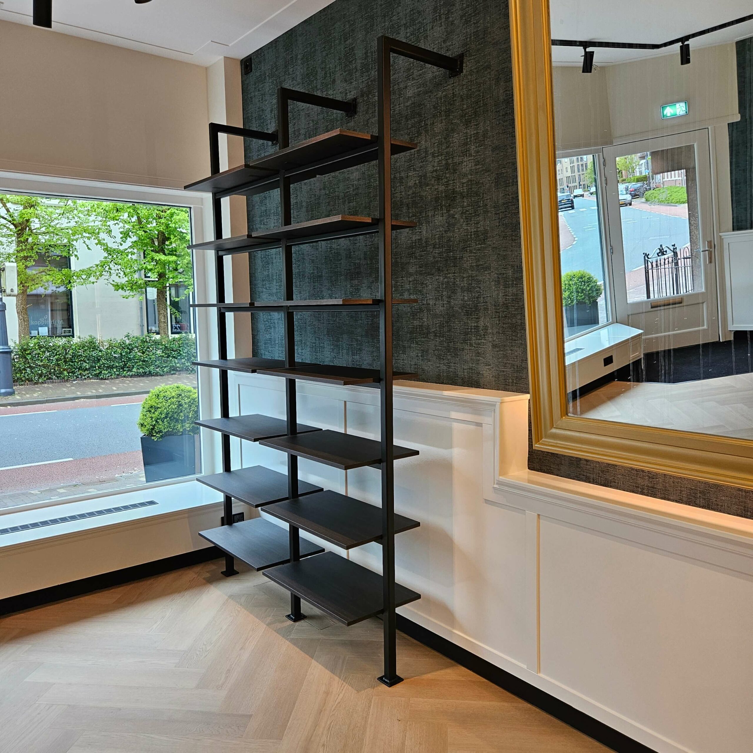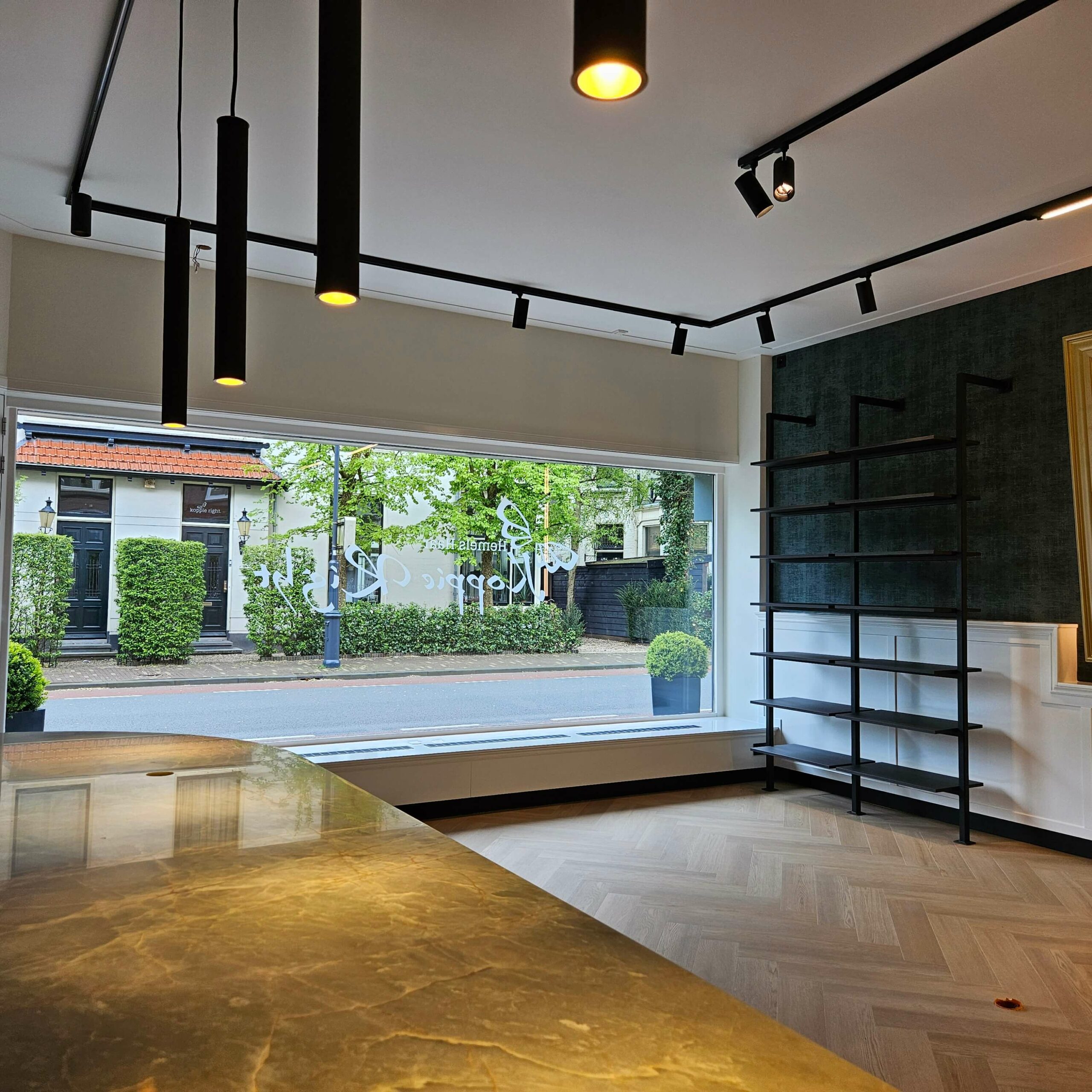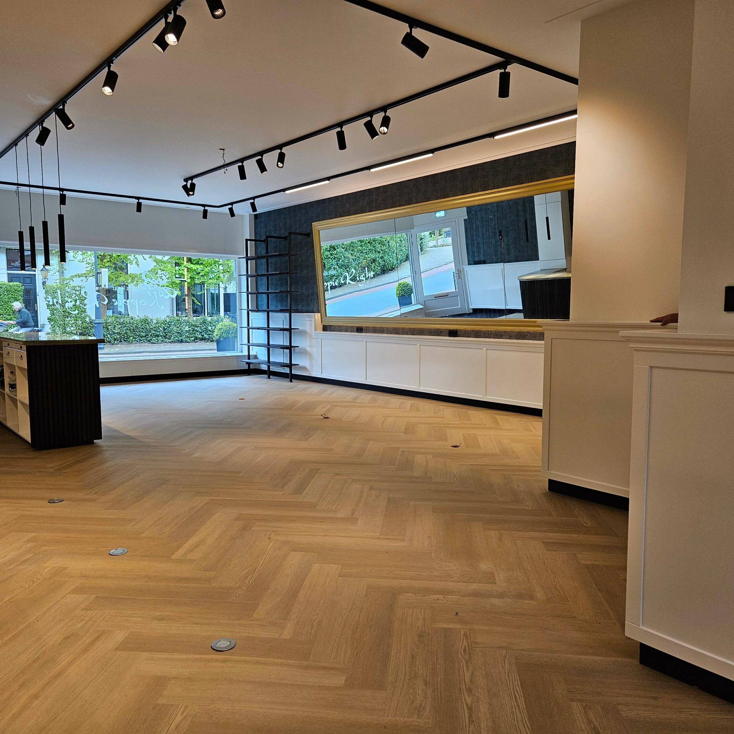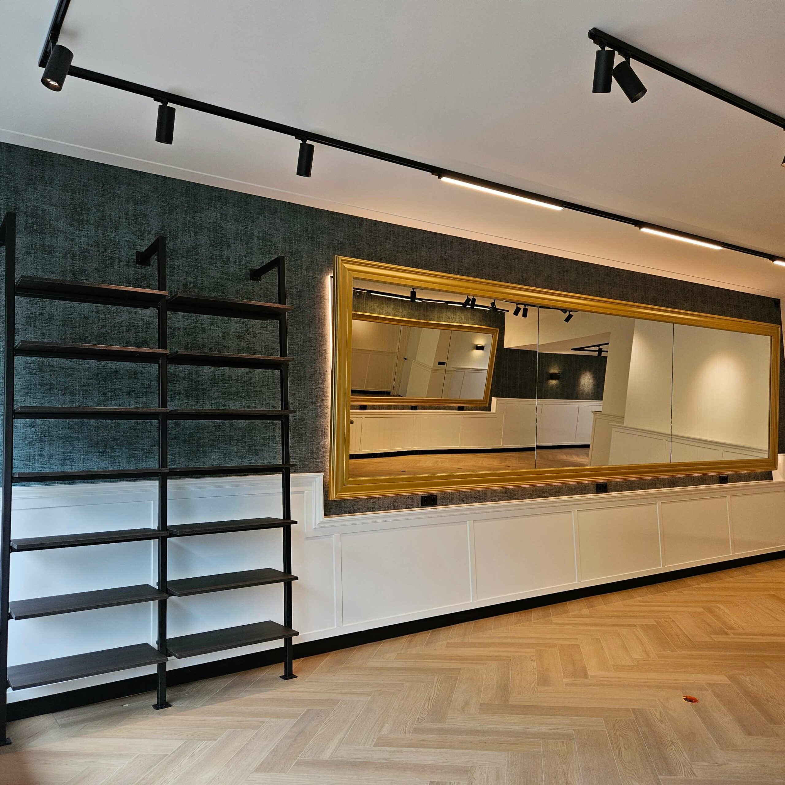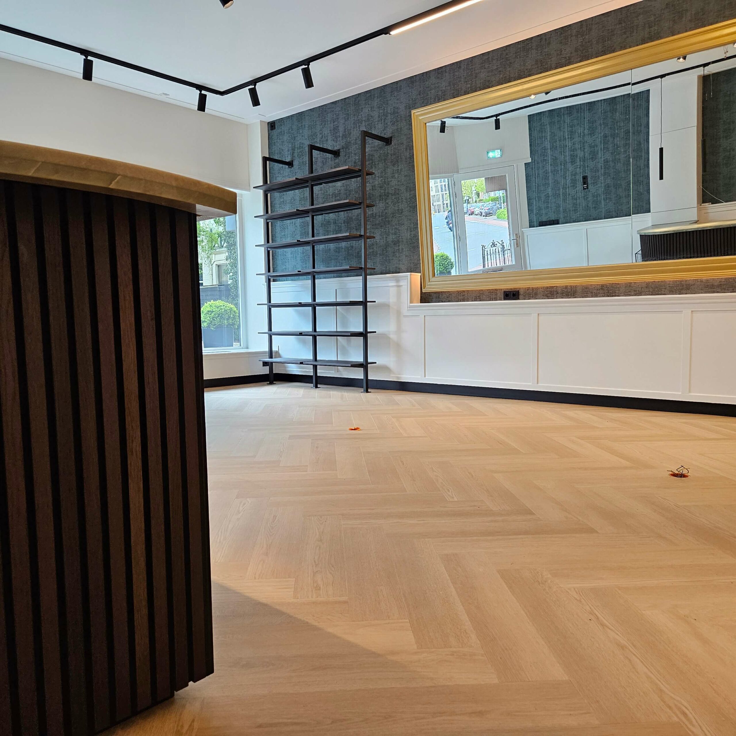 Na een grote waterschade hebben we deze kapperszaak volledig hersteld en vernieuwd. De plafonds zijn opnieuw opgebouwd met brandwerende gipsplaten en akoestische isolatie. Wanden, lambrisering en voorzetwanden zijn opnieuw getimmerd en strak gestuct. De gietvloer en toonbank zijn vervangen — de nieuwe toonbank kreeg een marmeren blad met eiken accenten. De stalen kast is op maat gemaakt door ons zusterbedrijf Van Vorden Staal BV. Alles is geschilderd en afgewerkt tot in detail, met als resultaat een moderne, frisse salon die weer helemaal klopt.