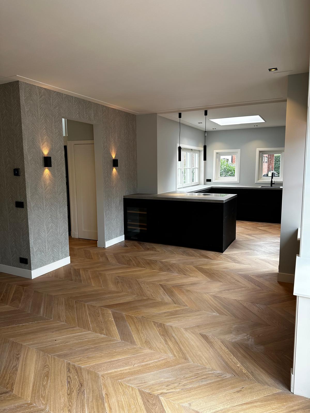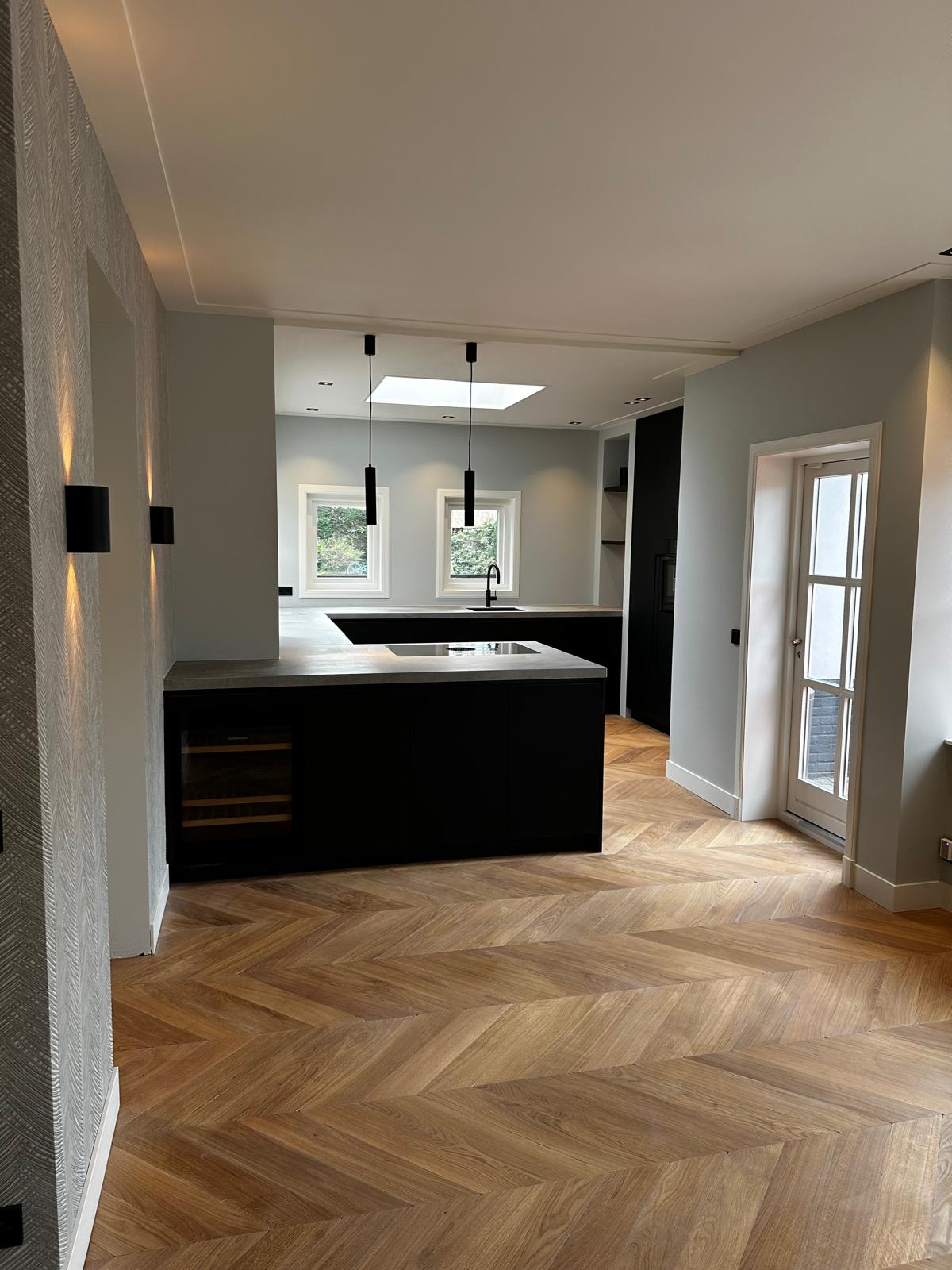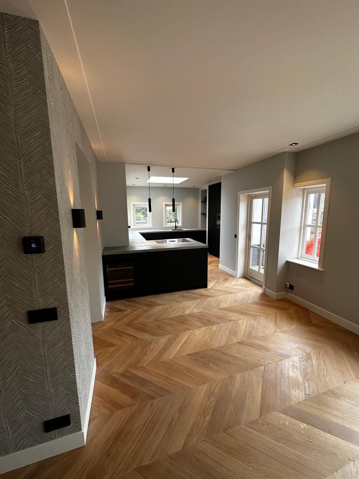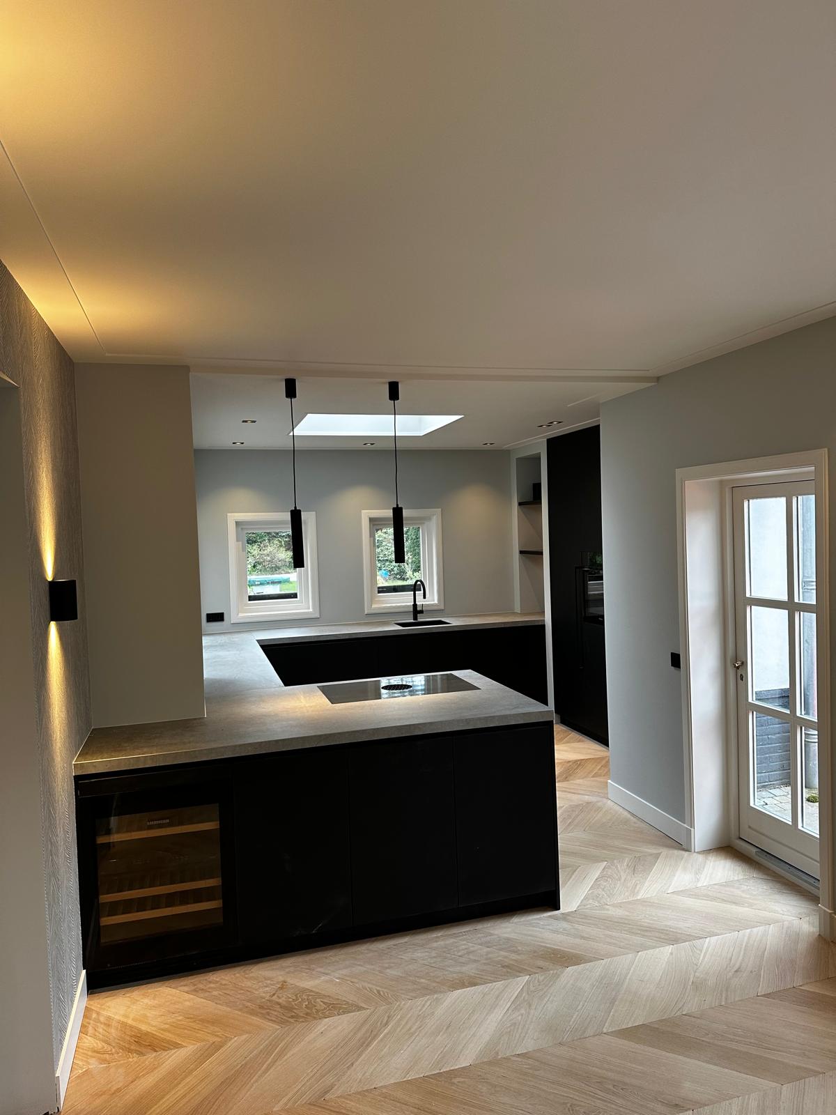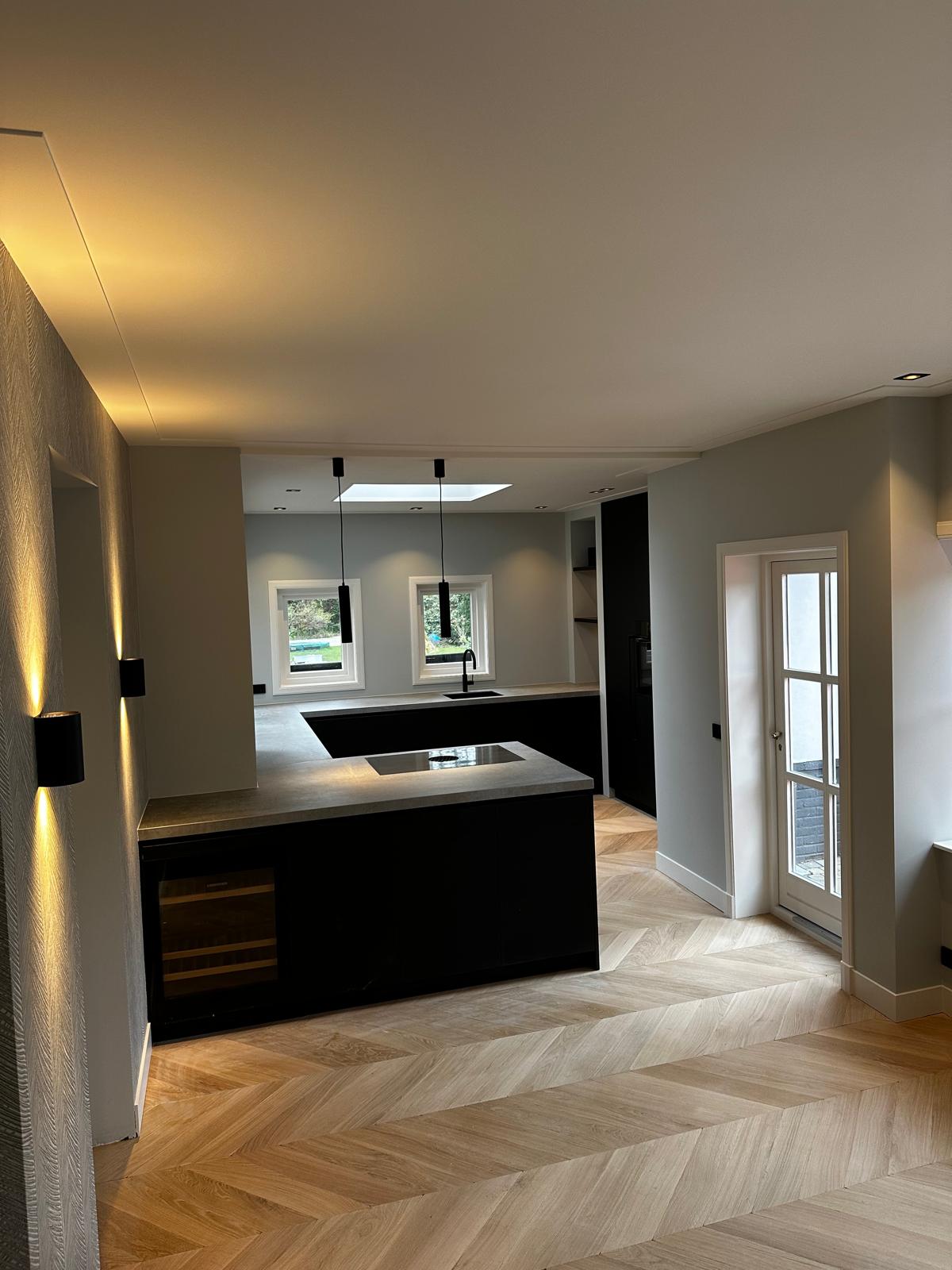 Aan deze woning hebben we een complete vernieuwing van de begane grond uitgevoerd. Alle oude plafonds, wanden, vloeren en de keuken zijn verwijderd, waarna nieuwe voorzetwanden met isolatie, plafonds en maatwerk kasten zijn aangebracht. De dragende muren tussen woonkamer en keuken zijn gesloopt en vervangen door een nieuwe staalconstructie met HEB- en hoekprofielen, inclusief kolommen — al het staalwerk op maat geleverd door ons zusterbedrijf Van Vorden Staal BV.