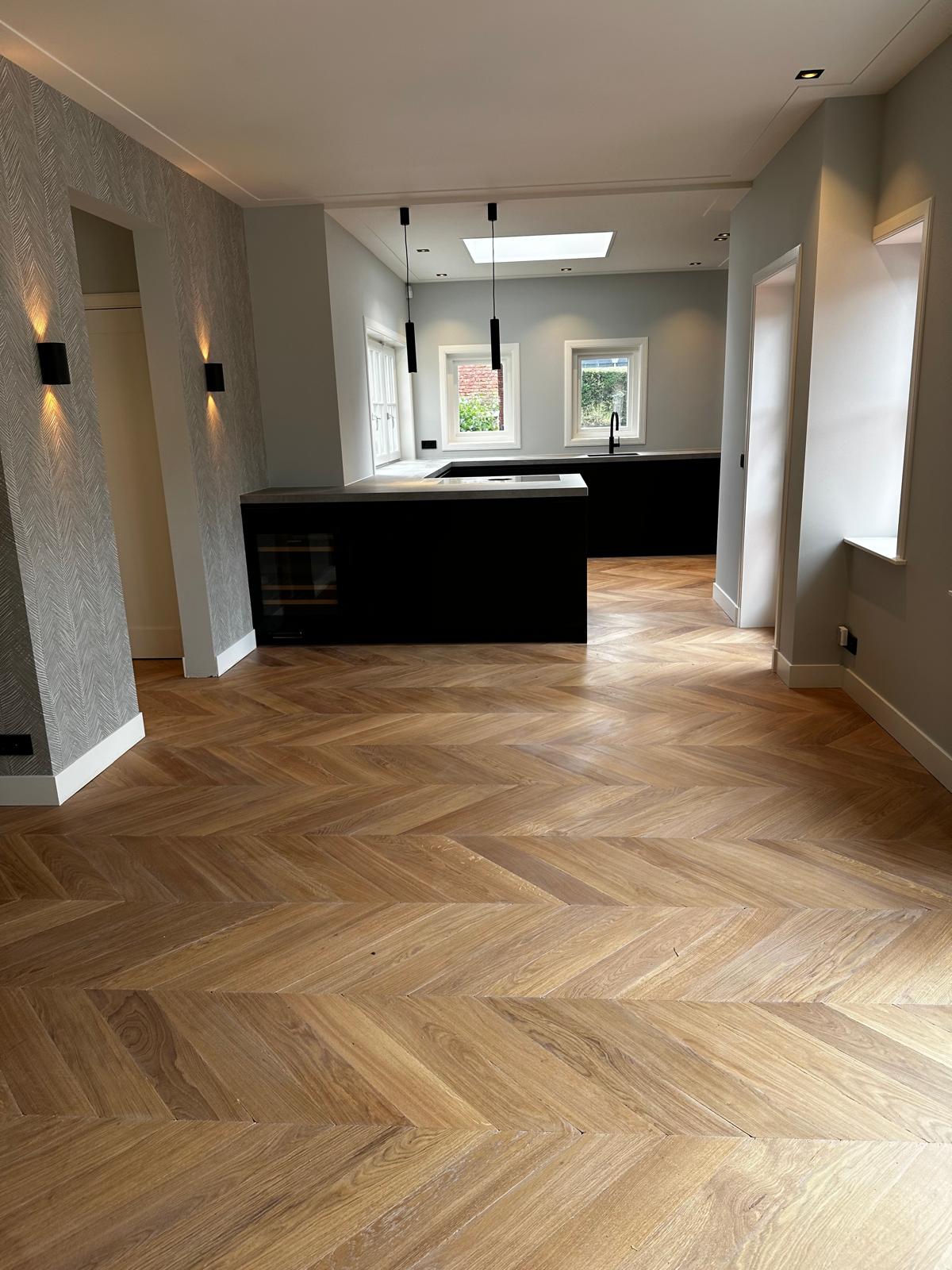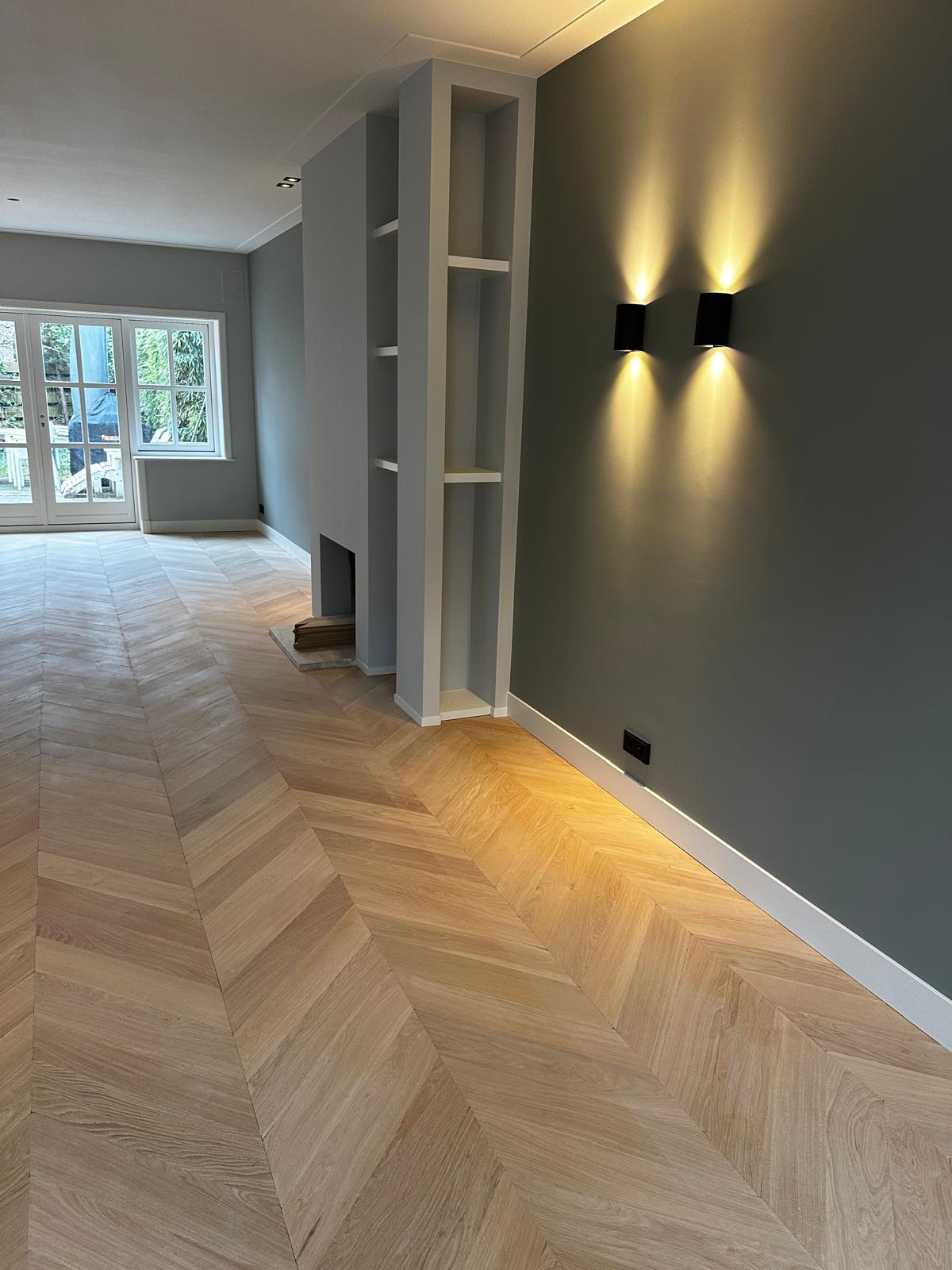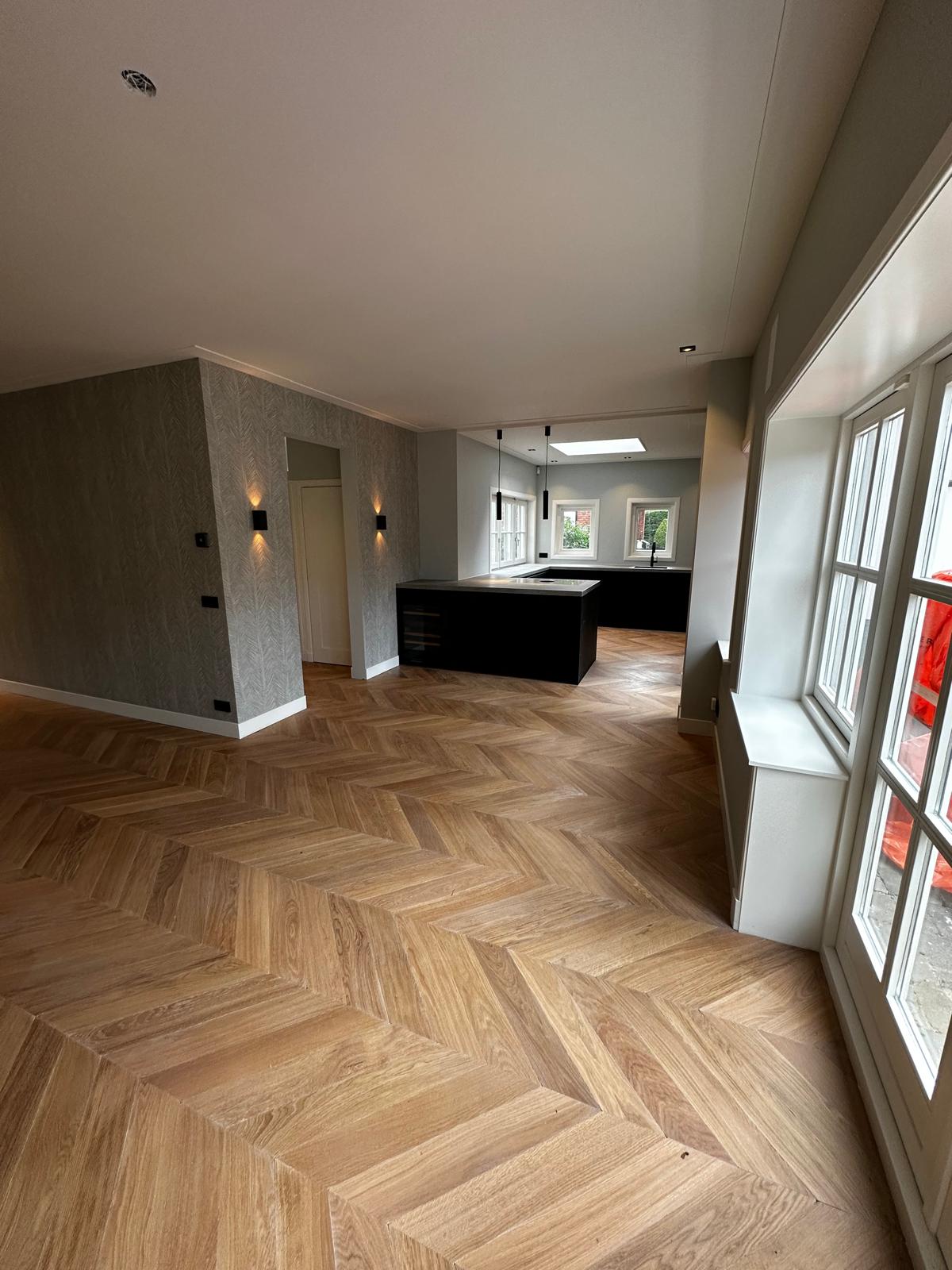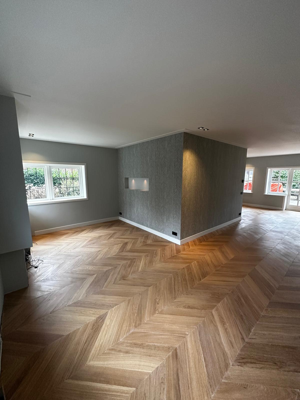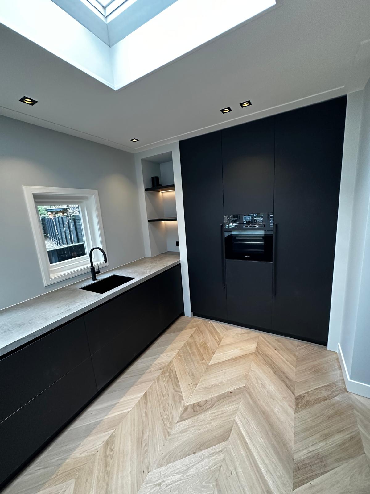 Aan deze woning hebben we een complete vernieuwing van de begane grond uitgevoerd. Alle oude plafonds, wanden, vloeren en de keuken zijn verwijderd, waarna nieuwe voorzetwanden met isolatie, plafonds en maatwerk kasten zijn aangebracht. De dragende muren tussen woonkamer en keuken zijn gesloopt en vervangen door een nieuwe staalconstructie met HEB- en hoekprofielen, inclusief kolommen — al het staalwerk op maat geleverd door ons zusterbedrijf Van Vorden Staal BV.